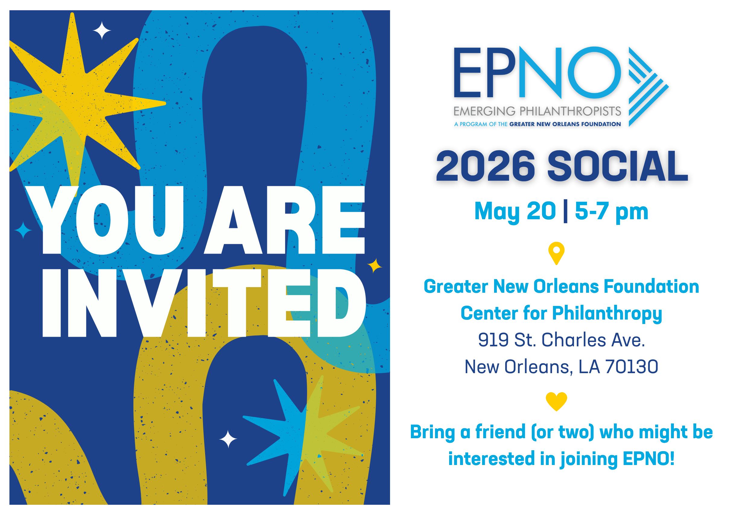Emerging Philanthropists of New Orleans (EPNO), a program of the Greater New Orleans Foundation to inspire and educate our region’s next generation of philanthropists, invites you to join us to learn more about joining our 2026 cohort on May 20 at the Greater New Orleans Foundation’s Center for Philanthropy! EPNO alumni, past grantees, and prospective EPNO cohort members are invited to join us for refreshments, interactive activities hosted by two past EPNO grantees, and to learn more about joining this year’s EPNO cohort.