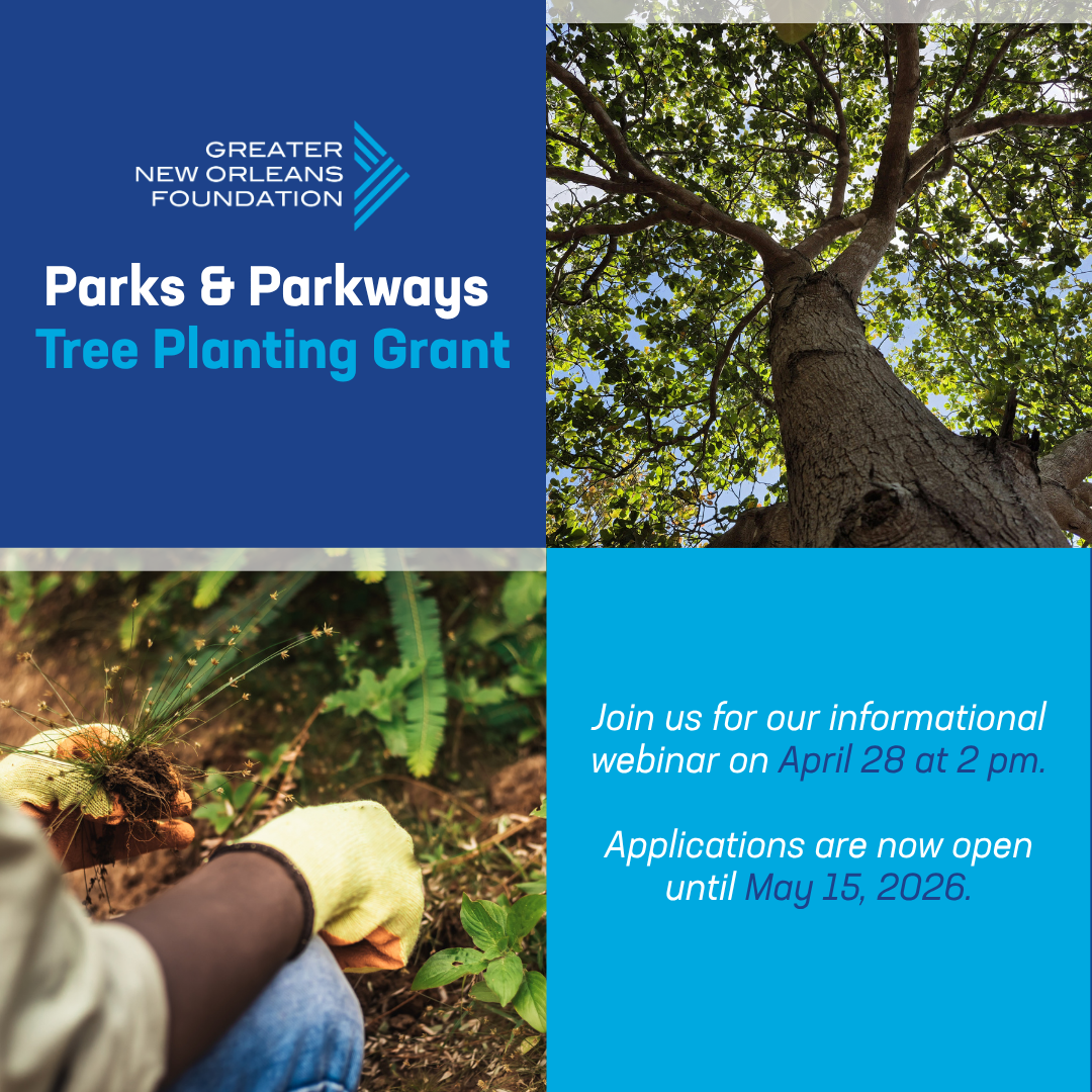 In partnership with the City of New Orleans’ Department of Parks and Parkways and with one-time funds allocated by the City Council, the Greater New Orleans Foundation is accepting grant applications from nonprofit partners in Orleans Parish to plant trees on public property across the city. The Tree Planting Grants will help the City reach its goal of restoring and expanding New Orleans’ urban forest with 40,000 new trees planted by 2030. Applicants are welcome to attend the informational webinar on April 28 at 2 pm. Sign up for the webinar here.